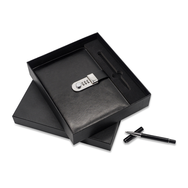 Elegancki czarny, 100 kartkowy notes w linie (80g/m2) w okładce z ekoskóry, wyposażony w zamek szyfrowy, w komplecie z długopisem. Wkład w kolorze niebieskim. Zapakowany w pudełko prezentowe.